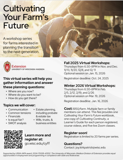 Join our UW-Madison Division of Extension Farm Management Specialists, Joy Kirkpatrick, Steph Plaster, Kelly Wilfert, and Kevin Bernhardt as they lead discussions and activities during the Cultivating Your Farm’s Future workshop series. This program will provide tools and resources for farmers who want to start their succession plans.