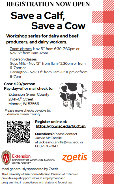 The University of Wisconsin Division of Extension is offering a Save A Calf, Save A Cow workshop series for dairy and beef producers, and dairy workers (in Spanish). This workshop provides information and techniques to boost your confidence in preparing the cow for calving, obstetric techniques and newborn calf care. From transition cow diets and body condition to recognizing key signs of labor and handling difficult deliveries with precision, this program equips you with practical strategies to support both cow and calf health. Whether you’re seasoned or new to livestock care, you’ll gain hands-on expertise to approach calving with assurance, improve outcomes, and enhance the well-being of your herd.