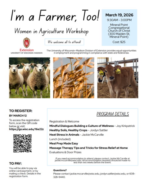 The Regional Crops & Soils, Dairy, and Livestock Educators for Grant, Green, Iowa, and Lafayette Counties will be hosting a FREE event for agricultural producers involved in forage production and management on March 5th from 10:30 am – 2:00 pm at the Lafayette County Ames Multipurpose Building in Darlington.