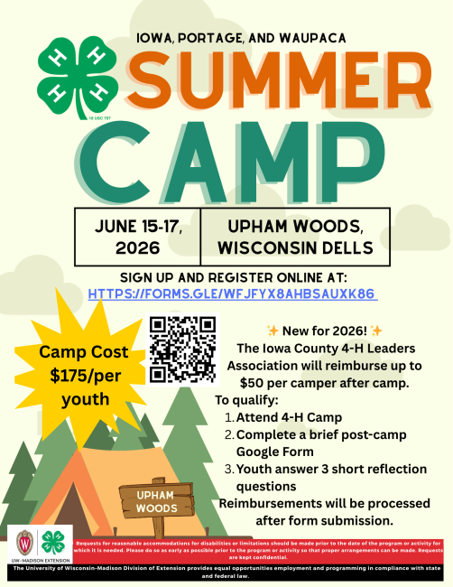 4-H Camp will be held June 15-17, 2026 at Upham Woods in Wisconsin Dells. Once again this year, Iowa County will be joining Portage and Waupaca Counties for an exciting, fun-filled camp experience! Registration is now open in 4-H Online!